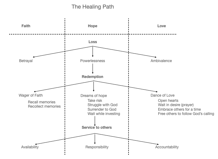 The healing path leads us to renewed faith, hope and love. It ultimately leads us to God and his specific calling for us through faith, hope, and love in service to others.